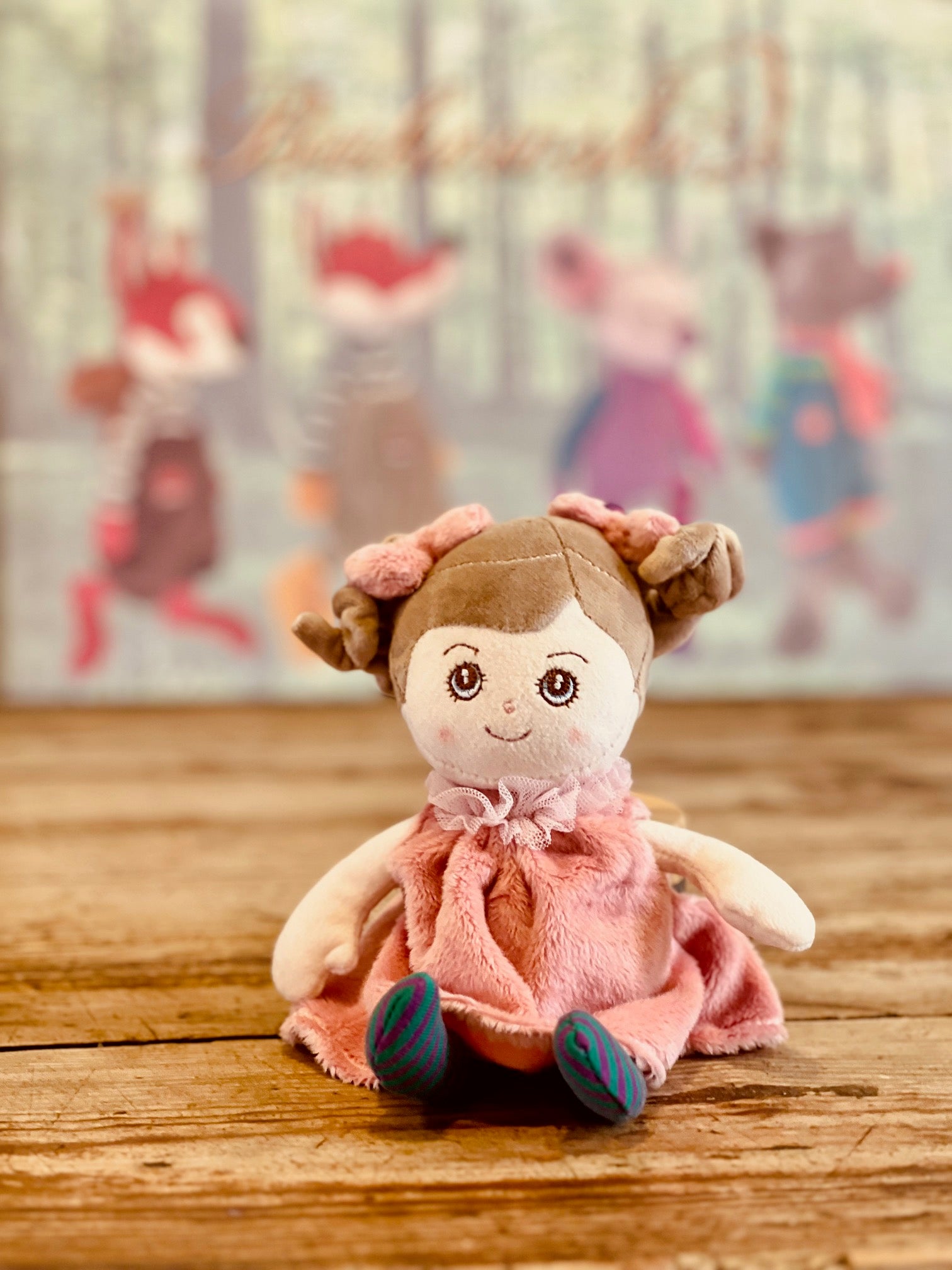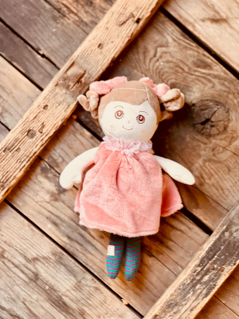 Pequeña muñeca de trapo vestida con un bonito vestido de terciopelo rosa y medias verdes y moradas.