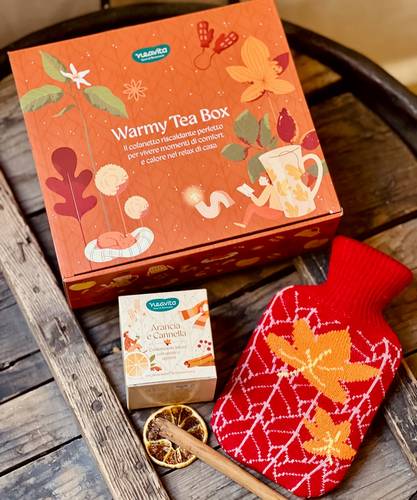 La Warmy Tea Box de Neavita está decorada con ilustraciones que calientan el corazón: hojas que danzan, especias, tazas humeantes y momentos de pura calma.