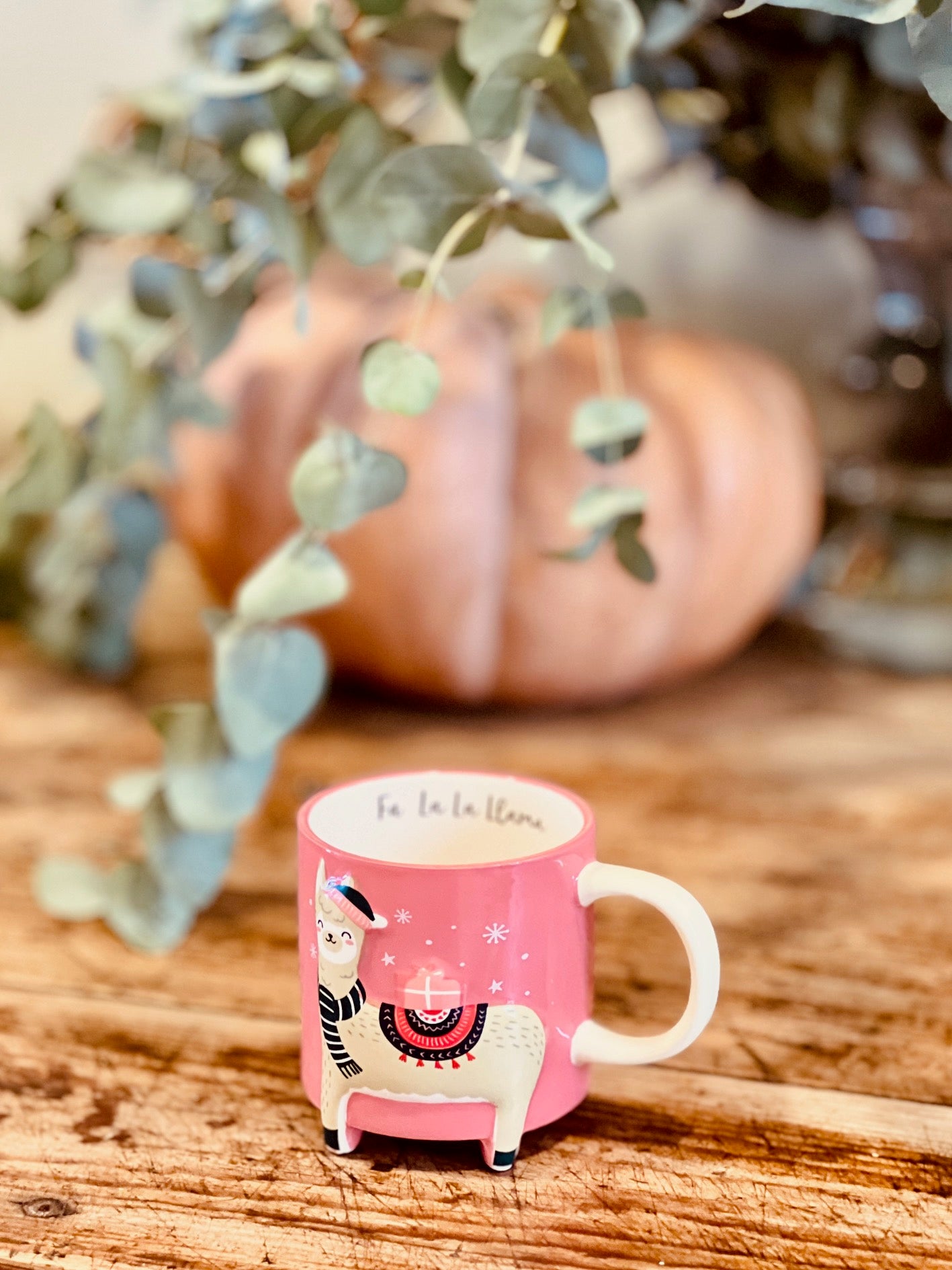 Su ilustración muestra una adorable llama con gorro y bufanda sobre un fondo rosa decorado con copos de nieve, creando una atmósfera invernal acogedora y alegre. Perfecta para regalar o para disfrutar de tus bebidas calientes favoritas en casa.