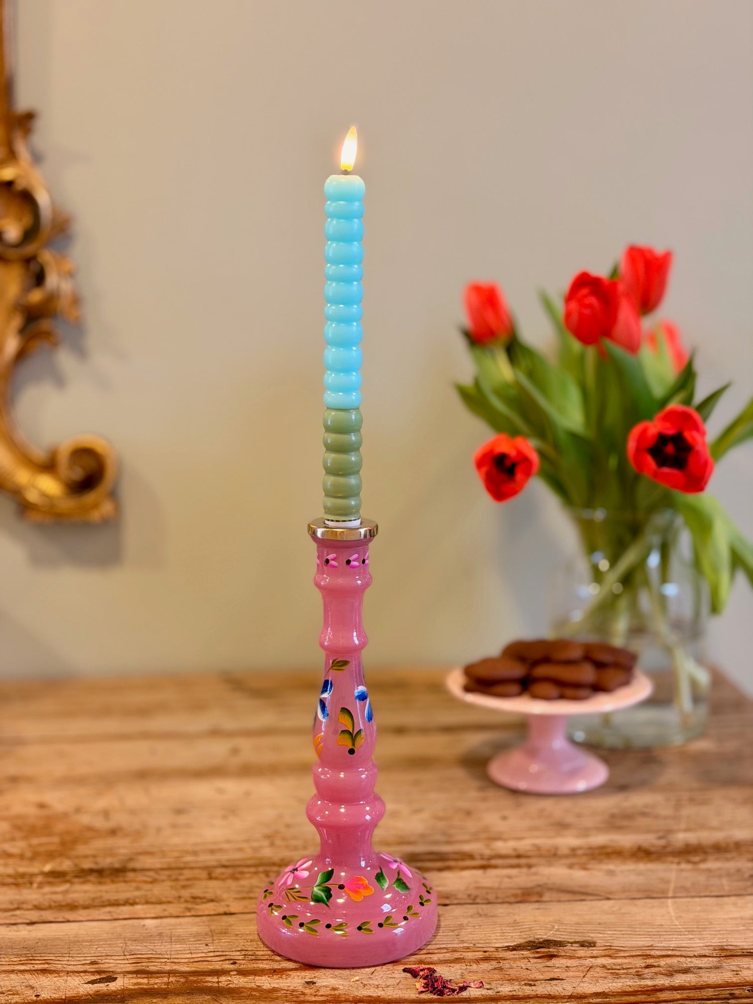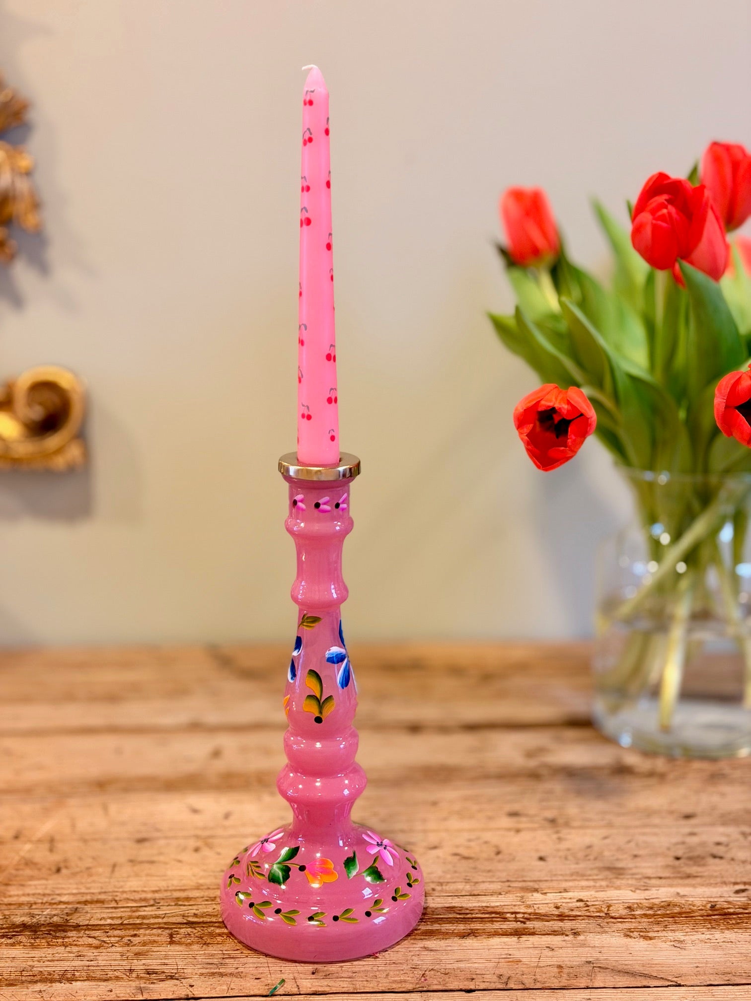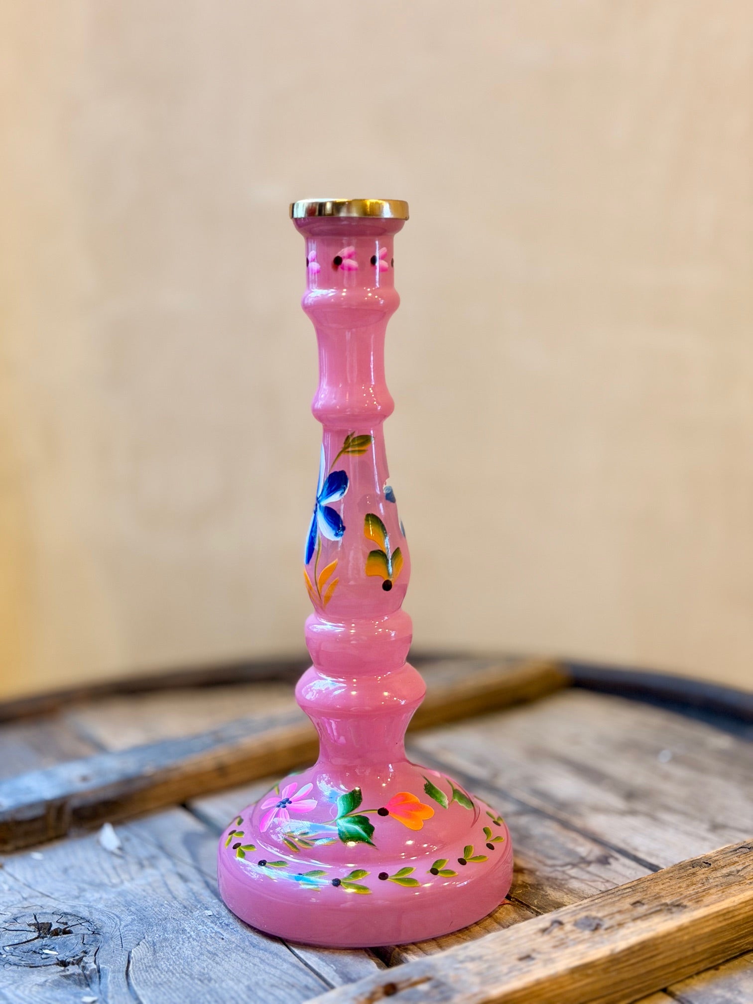 Bonito portavelas alto de color rosa con detalles florales pintados a mano. Está hecho de cristal y es perfecto tanto para dar un toque de color al salón como para decorar la mesa. El portavelas también está disponible en un tamaño más pequeño de color marrón claro - pon los diferentes portavelas juntos o por separados. Recomendamos usar puños de luz junto con este producto.