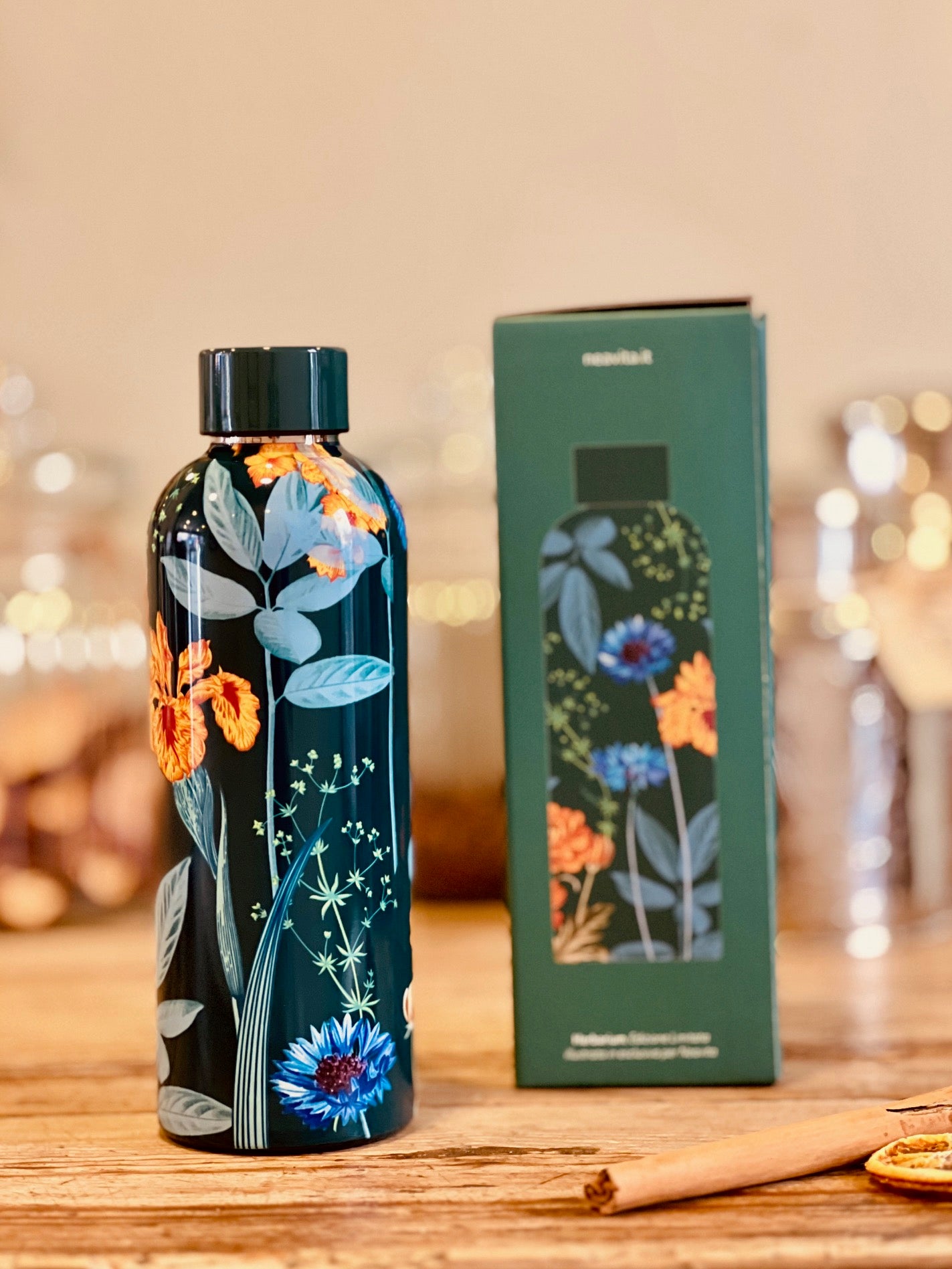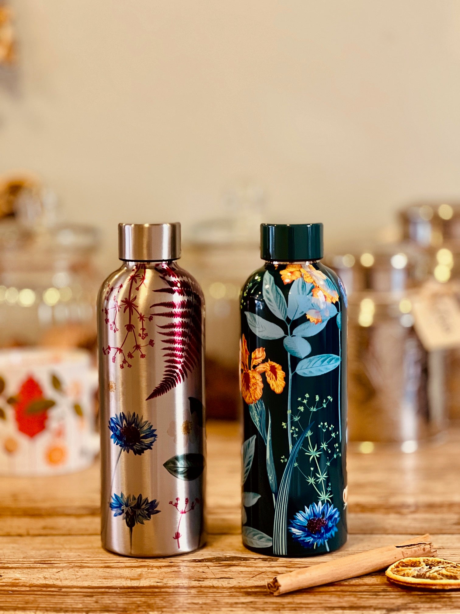 Elegantes botellas térmicas con detalles botánicos, perfectas para tomar té, infusiones y tisanas durante largos periodos, manteniendo la temperatura ideal.