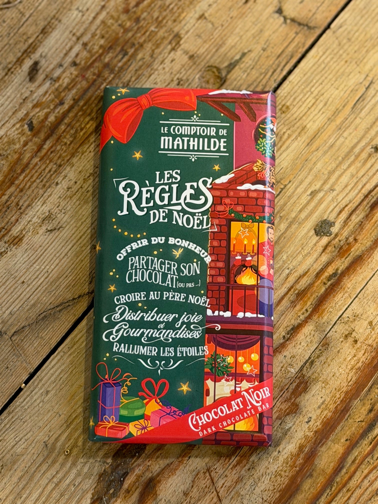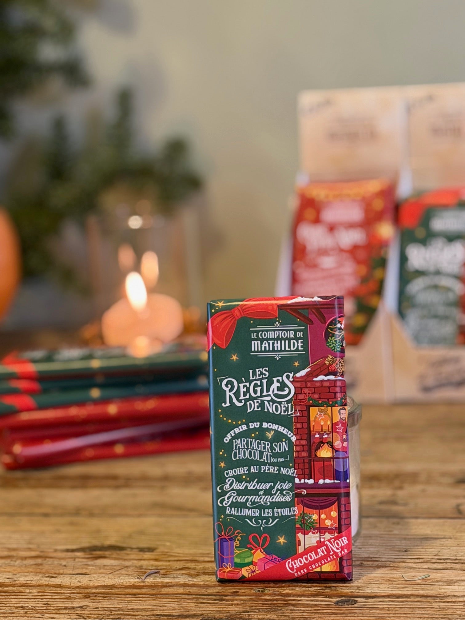 El envoltorio navideño aporta un aire festivo y divertido con la frase: “Noël appartient à celui qui croque le chocolat en premier… est-ce que ce sera vous ?”. Una invitación deliciosa para disfrutar del chocolate antes que Papá Noel.