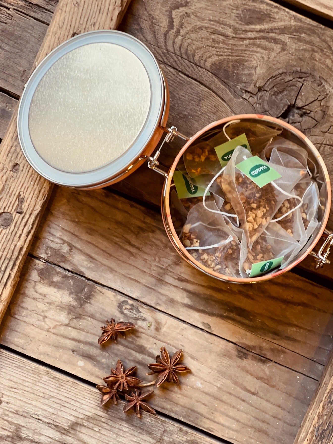 Lata resellable con 12 bolsitas de té infusionadas con naranja y canela.