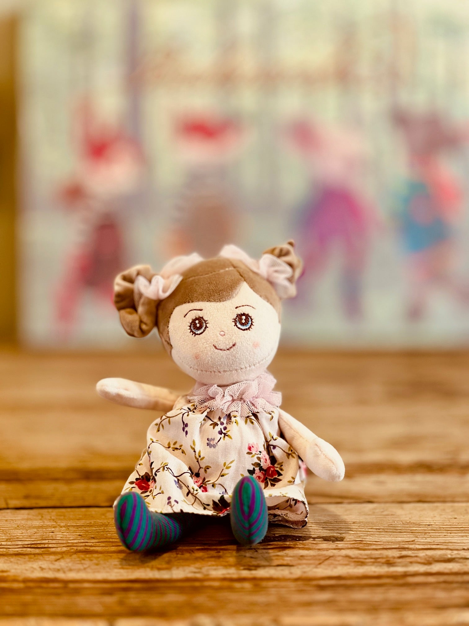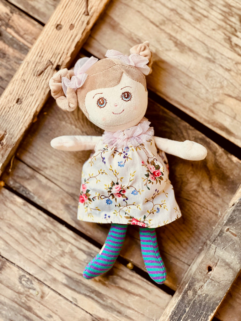 Una muñeca pequeña, ligera y frágil, hecha de tela, vestida con un vestido veraniego con estampado floral. Bukowski Design utiliza materiales de la más alta calidad para su producción; todos los detalles de los juguetes están cosidos a mano, al igual que el bordado. Cada juguete ha superado las pruebas de seguridad de la UE antes de su comercialización.
